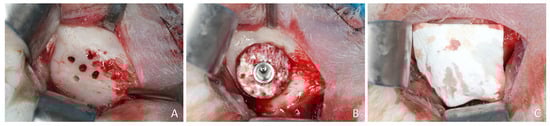 Onlay experimental site. (A) Recipient site prepared with perforations. (B) Block graft fixed with an implant at the top of the experimental region. (C) A collagen membrane placed at the top of the experimental region.