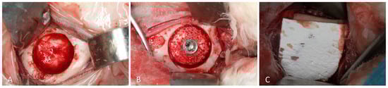 Trephines and drills were used on the opposite side to obtain a defect ~7 mm wide and ~3 mm deep. (Figure 3A). The xenogeneic bone block was adapted within the defect at the level of the adjacent bone and fixed with an implant 8.5 mm long and 3.25 mm in diameter (Leader Medica, Padua, Italy) (Figure 3B). After placement of the cover screw, the region was covered with a collagen membrane (BioGuide®; Geistlich Pharma AG, Wolhusen, Switzerland) (Figure 3C). The wound closure was performed using Vicryl 4-0 (Ethicon, Johnson & Johnson, Cincinnati, OH, USA) for the muscle layers and Nylon 4-0 (Ethicon, Johnson & Johnson, USA) for the skin, employing simple interrupted sutures.