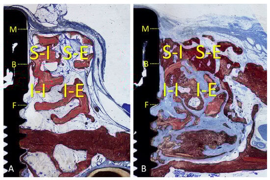 An Eclipse Ci microscope (Nikon Corporation, Tokyo, Japan) connected to a computer was used for histological assessments by applying a ×10 lens. All histomorphometric assessments were performed with the software NIS Elements D software (v 5.0, Laboratory Imaging, Nikon Corporation, Tokyo, Japan). As a linear evaluation, the distance between the implant margin (M) and the most coronal contact of the bone with the Implant surface (B, coronal level of osseointegration) was measured (Figure 4A,B). The gain of osseointegration was evaluated as the difference between the depth of the original defect (F, 3 mm from M) and the distance M-B. For morphometric measurements, a lattice was superposed on the image by applying point-counting methods. Four regions were evaluated within the grafted region, both sides lateral to the implant: inferior/internal (I-I), inferior/external (I-E), superior/internal (S-I), and superior/external (S-E). The following tissues were assessed: new bone, xenograft, soft tissues (marrow spaces, provisional matrix, dense and loose tissues, and connective tissue), and inflammatory infiltrate (Figure 4A,B). A correlation between the bone percentage in the S-I region and the gain of osseointegration was carried out.