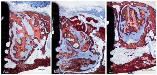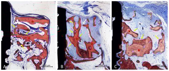 Photomicrographs of ground sections illustrating the healing in the onlay grafts. New bone was mainly found covering the trabeculae (A,B), in some cases reaching the most coronal regions (C). Landmarks indicating examples of tissues: yellow arrows, new bone; red stars, graft. Stevenel’s blue and alizarin red stain.