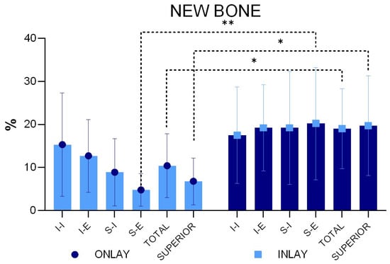The new bone percentage was higher at the inlay than at the onlay grafts in all four regions examined, with the difference being statistically significant only for the S-E region. When the bone percentages of the two superior regions were merged (mean S-E and S-I), a statistically significant difference was found between the two groups (p = 0.010).