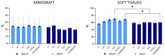 Xenograft and soft tissue percentages in the various regions examined. * p < 0.05 (Graphs produced with GraphPad Prism).