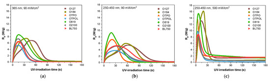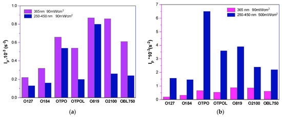 - Photopolymerization/phototelomerization processes during the UV curing of the coating formulations occurred much faster at high UV irradiance (conditions such as the UV curing process realized with a UV-ABC-type medium-pressure mercury lamp). Moreover, the kinetics of these processes indicated the higher reactivity of systems with APOs than HAPs (regardless of the incident light intensity).
