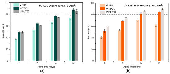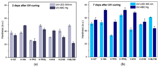 - The formulations with TPOL were suitable both for curing with UV LED at 365 nm and a UV-ABC-type medium-pressure mercury lamp (hardness values were similar).