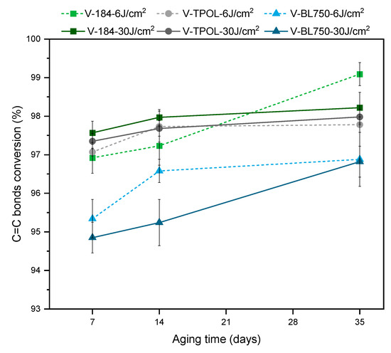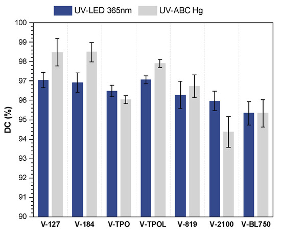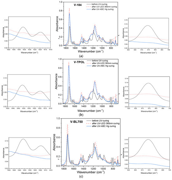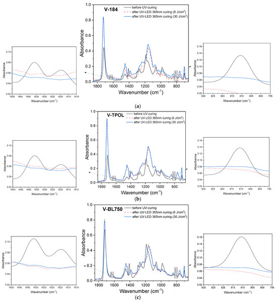 - Herrera-González, A.M.; Caldera-Villalobos, M.; Pérez-Mondragón, A.A.; Cuevas-Suárez, C.E.; González-López, J.A. Analysis of Double Bond Conversion of Photopolymerizable Monomers by FTIR-ATR Spectroscopy. J. Chem. Educ. 2019, 96, 1786–1789. [Google Scholar] [CrossRef]