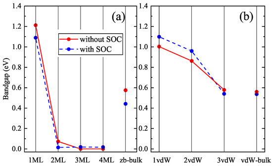 zb slabs are observed. The SOC inclusion leads to insignificant changes (about 0.1 eV) of the band gap values for all