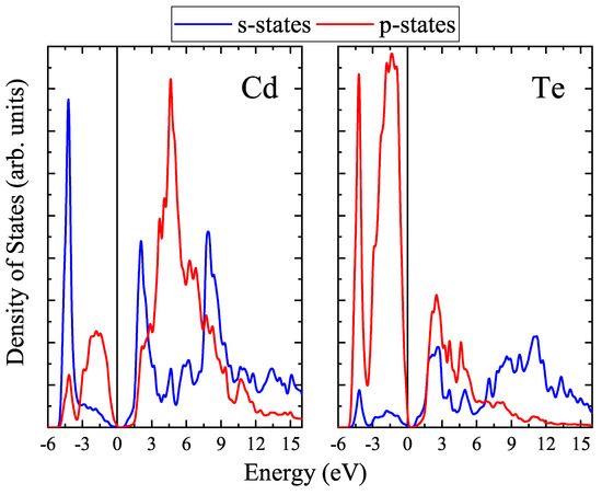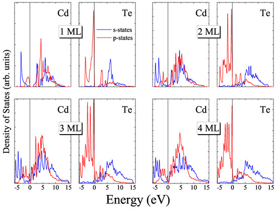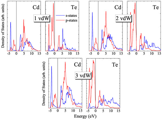 Figure 9. One can see that the top of the valence band consists mainly of 5p-states of Te atoms, the contribution of 5s-states for both types of atoms being negligible. The bottom of the conduction band is determined by 5s-states of Cd and hybridized 5s- and 5p-states of Te. The genealogy of the states for the bulk vdW CdTe was found to be similar to that of the bulk