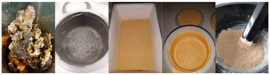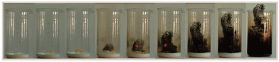 First, the raw materials were weighed to the nearest ±0.001 g in stoichiometric quantities. All compositions were prepared with a 5 wt.% excess of lead compound to protect them from evaporation during high-temperature processing. For each composition (Table 1), the aqueous solutions containing Pb2+ and La3+, as well as Pr3+ nitrates and trisamine, were prepared respectively. Similarly, to obtain the corresponding nitrates, proportional amounts of nitric acid were added to solutions of Zr4+ and Ti4+ propoxides. The prepared precursor solutions were mixed in the appropriate order with magnetic stirring. Subsequently, Trisamine was added to the solution as a reaction fuel and stabilizing agent (in a 1:2 mole ratio for each metal ion). Then, the resulting transparent sol solution was heated up to 70–80 °C and evaporated until a viscous ecru color gel was obtained. The outcome gel was heated further until the initiation of the combustion reaction. Gradual foaming of the solution and release of gases (N2, CO2) due to the decomposition of trisamine were observed. The initiation of the combustion synthesis process occurred at a point-like location, and the self-propagating combustion reaction followed a moving wave across the volume of the solution. Its duration was several seconds, and the extinction occurred spontaneously. The final result was an ashen gel with the consistency of a fine, fluffy foam (Figure 2), which contained the inorganic part and carbon residues of the combustion process.