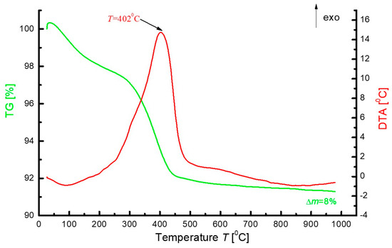 After fine grinding, the obtained gel-combustion powders of each PLZT:Pr3+ composition containing soot residues were subjected to thermogravimetric analysis (TGA) and differential thermal analysis (DTA). All samples showed the same trend, as shown in Figure 4. The TG curves show a two-stage mass loss: The first was about 2% and ranged from 30 to 250 °C, which may be due to gel decomposition and elimination of water content from the prepared sample, and the second was about 6% and occurred between 250 and 475 °C—accompanied by a strong exothermic effect—which can be interpreted as combustion of organic parts and soot formed in the first stage of synthesis. The presence of one exothermic peak in curve DTA also indicates the beginning of crystallization of the perovskite phase. Above the temperature of about 550 °C, the mass became fixed, which could indicate the stability of the composition. X-ray studies show that at temperatures of 600 °C, a perovskite phase of PLZT is formed, known to be stable until above 1000 °C when a lead is partially released.