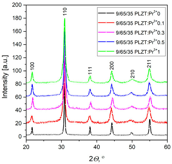 The Rietveld refinement method, fixed into the X’Pert High Score (Panalytical, B.V) computer program, was used to calculate the elementary cell parameters. For the diffraction pattern fitting, a structure model from the ICDD database was used (PDF standards, N° 00-046-0336, 00-053-0785). The calculated values of the crystallographic parameters and the reliability factors determining the goodness of refinement (Rp—reliability factor of the weighted patterns, Rwp—reliability factor of the patterns, Rexp—expected weighted profile factor) are summarized in Table 3. It is worth noting that the fitting parameters Rp and Rwp are smaller than 9%, indicating that valid refinement results were obtained. Based on the analysis, it was found that each of the HUP-sintered (Ts = 1100 °C) PLZT:Pr3+ bulk ceramics sample exhibits a complete perovskite phase and shows good homogeneity, as well as the formation of a single-phase compound with a pseudocubic structure with no pyrochlore (A3B4O13) (Figure 8). Also, the praseodymium doping does not change the symmetry of the perovskite lattice structure of 9/65/35 PLZT, regardless of the amount of dopant. It means that the Pr3+ ions have diffused into the host lattice, and the emerging lower symmetry may create conditions for ion off-centering and, thus, ferroelectricity of materials.