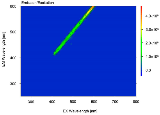 The 3D fluorescence spectra or excitation–emission matrices (EEMs) (Figure 9) were obtained from 250 to 600 nm in excitation at 5 nm intervals and from 250 to 800 nm in emission at 5 nm intervals. For undoped ceramics, no spectra were observed; only characteristics contour maps from the xenon lamp.