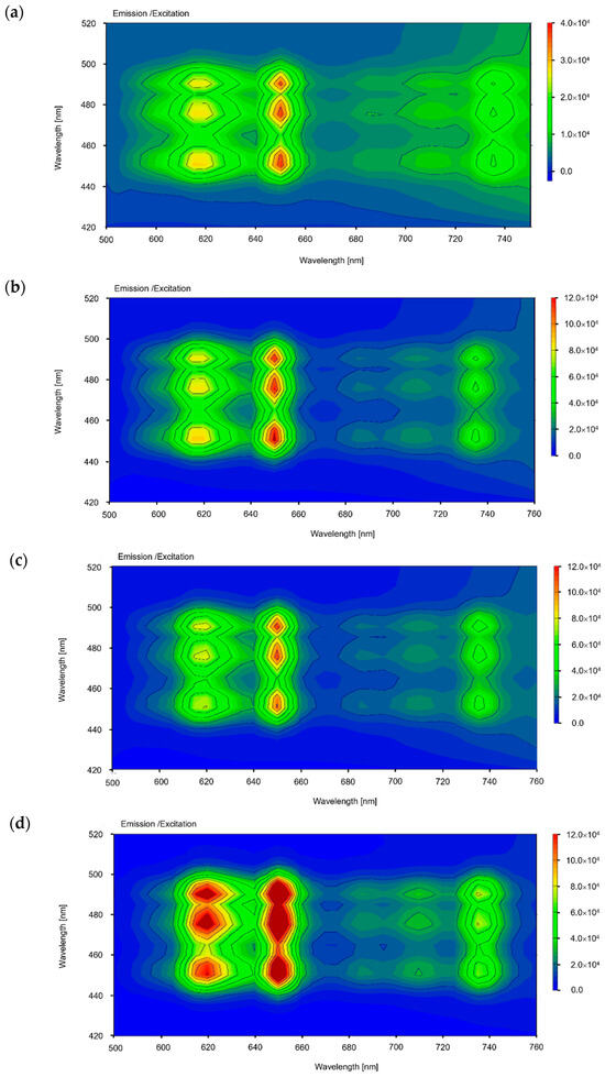 In the case of 9/65/35 PLZT:Pr3+, 3D fluorescence spectra display fluorescence intensity in the contour “maps” formed in excitation–emission (Figure 10a–d), exhibiting fluorescence emission in the orange region of the visible spectrum with a peak at 650 nm.