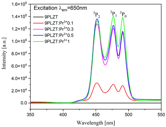 The excitation spectrum measured for the sintered samples is presented in Figure 11 and was recorded at λem = 650 nm. As mentioned above, the range was chosen based on the center of the most intense emission band corresponding to the 3P0→3F2 transition. One can see that the spectrum consists of three typical narrow bands associated with Pr3+ ions, which correspond to transitions originating from the 3H4 ground state to the 3P2. The 430 to 490 nm range is associated with the 3H4→3P2 (~450 nm), 3H4→3P1 (~476 nm), and 3H4→3P0 (~490 nm) transitions [52]. The bands are split because of the crystal-field effects. In addition, it can be seen that increasing the doping of Pr3+ ions from 0.1 to 1 wt.% in the 9/65/35 PLZT ceramic matrix also increased the excitation intensity.