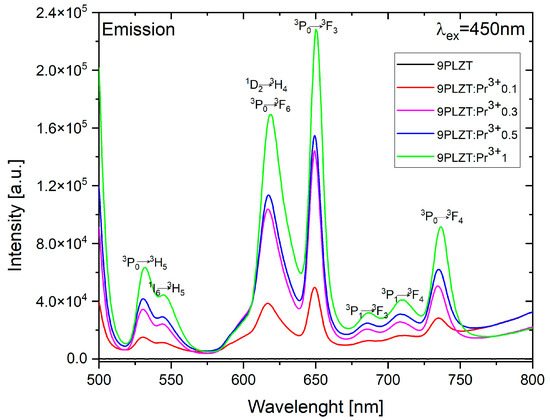 Interestingly, in the presence of lanthanum ions in ceramics, emission bands shift towards the red, and doping with praseodymium ions resulted in a rich emission spectrum, especially in the bright and dark red range. Red emission lines are due to 3P0→3F6 and 3P0→3F2. The strongest emission effect, obtained at a wavelength of 650 nm, can be considered characteristic of the perovskite structure of PLZT:Pr3+ ceramics. For simple titanates, e.g., BaTiO3, SrTiO3, (Ba,Sr)TiO3, this effect occurs for lower wavelengths between 600 and 620 nm [53,54], and the obtained results once again confirm that the red emission dominates over blue emission similar to oxide host matrices. In general, the intensity of the emission lines depends on the activator concentration and technological conditions, as studied by the author in an earlier paper [40]. As already mentioned, the obtained 9/65/35 PLZT:Pr3+ samples showed a high level of ceramization due to the combination of the applied method of nanopowder synthesis and high-temperature densification of the samples using the HUP method. As a result, the nearest environment between optically active ions becomes more ordered, leading to an increase in the intensity of emission lines, even when using small amounts of dopant-activator ranging from 0.1 to 1 wt.% Pr3+, as demonstrated in this work.