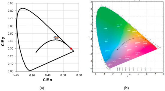 We also studied the influence of the concentration of praseodymium dopant on the luminescence intensity for obtained samples. It stated that the content of praseodymium ions changes the shape of luminescence bands of optically active dopants. From this point of view, the Commission Internationale de I’Eclairage (CIE) chromaticity coordinates are calculated [55]. The diagram of CIE coordinates for 9/65/35 PLZT:Pr3+ ceramics is shown in Figure 13. The posted emission spectrum corresponds to the emitted color with CIE coordinates x = 0.496–0.529 and y = 0.445–0.446, i.e., the resulting PLZT:Pr3+ phosphor emits orange light, as well as reddish-orange color (x = 0.699, y = 0.301). There is, of course, the possibility of using filters and obtaining a red color.