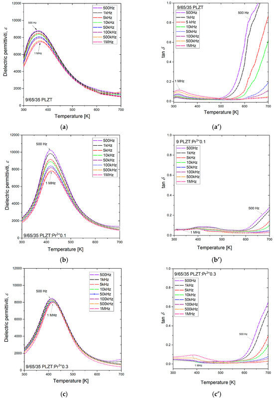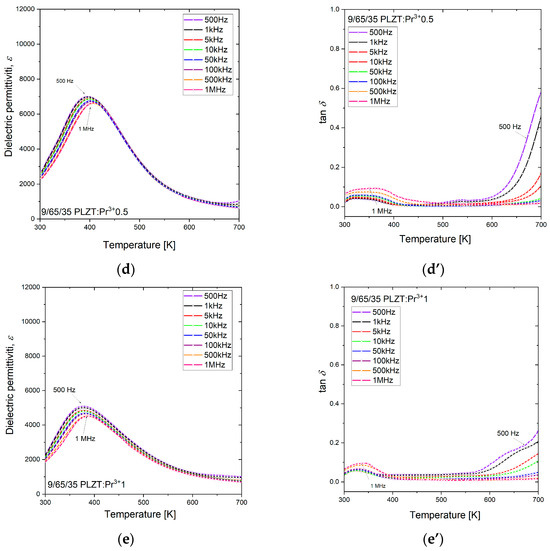 The dielectric constant (a–e) and the loss factor (a’–e’) versus temperature measured for a heating process at frequencies from 0.5 kHz to 1 MHz for 9/65/35 PLZT:Pr3+ ceramics.