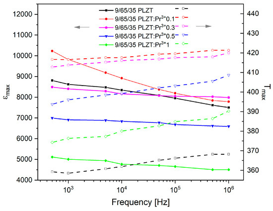 The low-frequency (1 kHz) temperature dependence on the dielectric constant measured for 9/65/35 PLZT:Pr3+ ceramics demonstrates how the used praseodymium dopants influenced the dielectric behaviors of the PLZT ceramics matrix (Figure 16, Table 4).