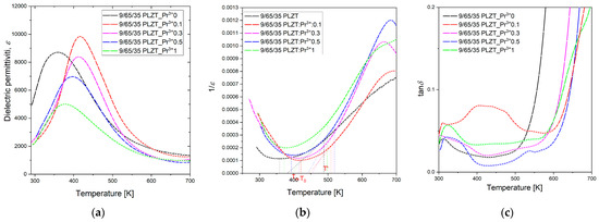 Temperature dependence of the (a) dielectric permittivity, (b) reciprocal of the electric permittivity, and (c) loss tangent δ, measured at f = 1 kHz for the 9/65/35 PLZT:Pr3+ ceramics.