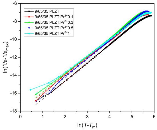 Data analysis shows that a small admixture of praseodymium ions (0.01 wt.%) causes a significant increase in Δεmax and the reduction in ΔTm. With the next increase in the content of praseodymium ions to 1 wt.%, an increase in both parameters confirms the increasing frequency dispersion. However, the values of ΔTm differ significantly from those obtained for classic relaxors, such as 8/65/35 PLZT, for which ΔTm = 25 K [57]. The determined values are summarized in Table 3.