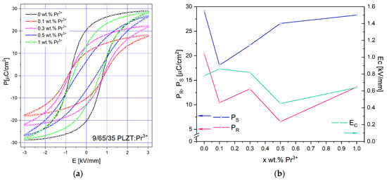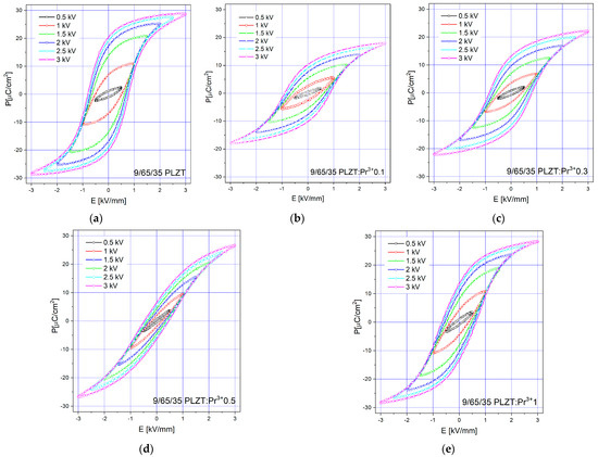 The room temperature hysteresis loop of all examined samples is shown in Figure 19a. One can see that the loop area of the PLZT:Pr3+ is smaller than that of 9/65/35 PLZT. The loop gets slender for the higher doping concentration of praseodymium (0.5 wt.%). The value of coercive field (Ec) and remanent polarization (PR) of the PLZT:Pr3+ compounds first decreases with increasing dopant amount and then increases for higher doping (1.0 wt.%) (Table 4). Several factors could be at play to explain this phenomenon. Firstly, the whole behavior could be linked to subtle variations in the composition of 9/65/35 PLZT as the amount of Pr3+ in the host lattice changes. Even minor changes in the composition can significantly affect the material’s ferroelectric properties. The material’s microstructure, including defects, can influence its dielectric and ferroelectric properties. As Pr increases, the microstructure may undergo changes that impact ferroelectric behavior. Changes in domain structure, including domain size, domain wall mobility, and domain pinning, can affect the shape of P-E hysteresis loops and the ferroelectric response. Complex interactions between ions (Pb, La, Zr, Ti) and the role of Pr doping or variations in their local environments could contribute to the observed behavior.