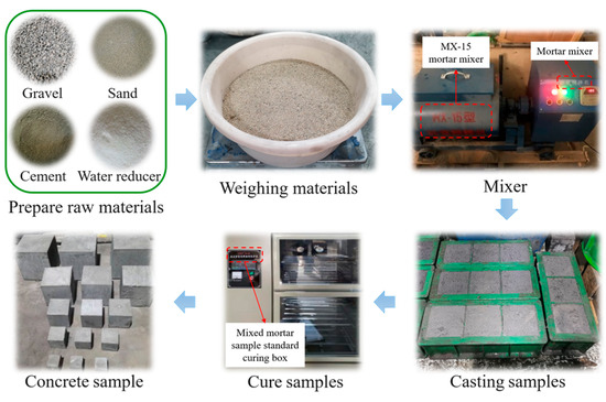 Procedures were based on the ratio of back–filling concrete materials along the gob-side entry retaining in 3307 working faces of a mine. Cement (PO 42.5), gravel (particle size grading 5–16 mm), river sand (modulus in 2.6–3.0), water reducing agent, and water according to the proportion of 0.56:0.85:1:0.0013:0.32 were mixed and stirred for 3 min. Pour the stirred slurry into the mold and vibrate it thoroughly for 30 s. Let it stand for 24 h before demolding. Place the sample in a standard curing box, set the temperature at 20 ± 2 °C, relative humidity of 90%, cure 28 d after the preparation of back–filling concrete samples [23]. The preparation process is shown in Figure 1. A total of 5 groups of size samples were prepared for this test, 3 samples in each group, and the sample sizes and numbers are shown in Table 1.