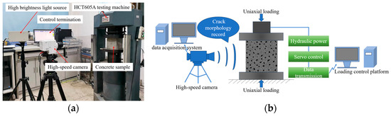 The sample loading and recording systems are shown in Figure 2a, and the testing principle is shown in Figure 2b. The uni–axial compression test was carried out using a microcomputer–controlled electro–hydraulic servo pressure testing machine (Shenzhen Wance Testing Equipment Co., Ltd., Shenzhen, China), setting a stress control mode, and a loading rate of 0.5 MPa/s. The development and evolution characteristics of surface cracks were recorded using a Phantom VE0710L high-speed camera (York Technologies Limited, Hong Kong, China) during the loading process in real-time, with a resolution of 512 × 256, shooting frame rate 400FPS, exposure time 30 μs, the exposure index was 20,000.