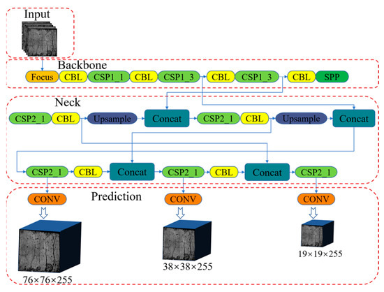 The network structure of the YOLOv5 detection algorithm is shown in Figure 3. The YOLOv5 algorithm based on Pytorch has advantages such as fast detection speed, high accuracy, and lightweight model; its network structure is mainly composed of input, backbone, neck, and prediction. Input was mainly composed of Mosaic data enhancement, adaptive anchor frame calculations, and adaptive crack expansion image scaling. Backbone mainly includes focus structure, CSP (cross stage partial) structure, CBL structure, and SPP (spatial pyramid pooling) structure. The focus structure sliced the input crack expansion image to obtain a double sampling feature map with complete information [24]. The CSP structure divided the input crack expansion image into two parts and a convolution operation was performed on them, respectively, and then the results of the two parts were spliced, which can increase the depth of the network structure, maintain the computational efficiency of the network structure, and improve the model learning ability [25]. CBL is a standard convolutional structure consisting of a common convolution layer (Conv), a batch normalization layer (BN), and an activation function layer (LeakyReLU). The SPP structure increased the receptive field range and feature expression ability of the model by maximum pooling after multiple convolutions of the feature layer [26]. The neck section is based on upsampling and Concat modules, adopts the structure of FPN + PAN, which conveyed high-level semantic information from top to bottom, and transmitted positioning features from bottom to top, complementing each other, significantly enhancing the network structure feature fusion ability [27]. In the prediction stage, GIOU_LOSS was used as the loss function of the bounding box, which greatly improved the accuracy of the bounding box. The NMS non-maximum suppression was used to screen the optimal bounding box at each target position and eliminate the redundant bounding box. Simultaneously, the Conv structure is used to downsample the input image and extract target features.
