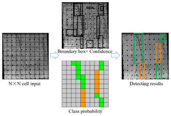 - Dividing the crack image into N × N grid units for image feature extraction, each cell generates a bounding box for different targets, with each bounding box containing the center point position (x, y), bounding box width and height (w, h), and conf (confidence). conf is a measure of the accuracy of the model’s prediction of the target box.where conf is divided into three part: Pr (object) represents the probability of the existence of the target. If there is no crack in the prediction box, Pr (object) = 0, otherwise it is 1; IoU (pred, truth) represents the intersection and union ratio of the prediction box and the real box; Pr (class) represents the probability that the prediction box belongs to each category.