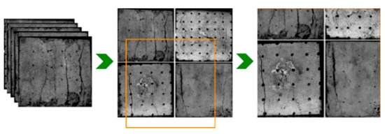 Creation of deep learning data sets from crack extension images of sample surfaces recorded by a high–speed camera during the loading process. A total of 2000 sample images of specimen surface cracks were selected for the loading process of 5 groups of size specimens; a total of 1500 labeled sample images were used as the training set and 500 unlabeled sample images were used as the test set. The open source software Labelimg (https://github.com/tzutalin/labellmg) was used to mark the cracks in 1500 sample images. The surface cracks on the image were marked as tensile cracks (TFs) and compression shear cracks (CSFs), respectively. At the same time, the Mosaic data enhancement technology was used to expand the data set [28]. The multiple crack expansion images were selected randomly and scaled, segmented, and then spliced into one image, which enriched the sample image data set to make the detection of small cracks more accurate, and improved the universality and robustness of the YOLOv5 network structure. The principles of data enhancement technology are shown in Figure 5.