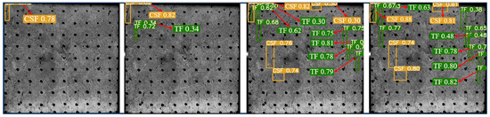 Dynamic crack test results of back–filling concrete samples. Note: Two colors of the prediction box (green and orange) correspond to two different types of cracks: TF and CSF. The value in the prediction box is confidence. Table format for output results can be found in Table S1.