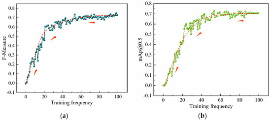 The training curve of the intelligent recognition algorithm model is shown in Figure 8. With the increase in the number of iterations training, the F1 value (F–Measure) and the average precision mean (mAp@0.5) gradually increased. When the iteration was close to 100 times, the F1 value and the average precision mean curve reached an equilibrium. After balancing, the F1 value and the average precision mean reached more than 70%, the F1 value was 75%, and the average precision mean was 71%. It shows that the constructed model achieved a better training effect.