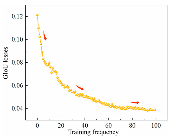 The curve of GIoU loss function with the number of iterative training times is shown in Figure 9. The GIoU loss rate curve shows a downward trend. The initial loss value of the model is about 0.124, the GIoU loss value reached 0.038 after 100 iterative training, and the model tended towards a stable state. It showed that after 100 iterative training, the YOLOv5 model achieved the overall optimal solution and the detection convergence effect was better.