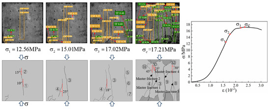 Based on the YOLOv5 crack identification algorithm, the surface crack expansion and evolution characteristics of the sample were obtained as shown in Figure 10. During the uniaxial compression process, micro cracks on the surface of the back–filling concrete sample first initiated at the end, and multiple secondary cracks developed in the middle of the sample and expanded and converged towards both ends. After reaching the yield stress, the cracks entered an unstable development stage, and the secondary cracks gradually connected to form one or more master cracks until instability and failure occurred.