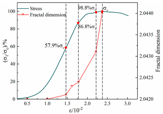 The relationship between the fractal dimension and the stress level during the loading process of the Sj200 sample is shown in Figure 11. During the uniaxial compression process, the fractal dimension of the surface cracks of the sample was basically consistent with the evolution characteristics of the stress–strain curve, showing a phased change characteristic of slowly increasing first and then suddenly rising. As the loading progresses, the fractal dimension of the surface cracks of the sample shows a slow increasing trend with increasing stress, and the complexity of the surface crack network of the sample gradually increases. When the loading stress value reached 57.9% σc, there was a secondary crack initiation on the sample surface, and the fractal dimension is 2.0421. When the stress was loaded to 86.8% σc, the fractal dimension increased to 2.0424. At this time, the sample reached the yield stress limit, and the crack development entered the unstable development stage. As the stress level continued to increase, a large number of cracks inside the sample expanded and converged to form a macroscopic master crack, and a large number of secondary cracks developed around the master crack. At this time, the growth trend of fractal dimension changed from a slow increase to a sudden increase, and the complexity of the crack network on the surface of the sample increased. When the stress was loaded to 98.8% σc, the crack further expanded to form multiple penetrating master cracks. The fractal dimension was 2.0431, and the fractal dimension growth rate increased again. The fractal dimension suddenly increased to the maximum value of 2.0440 at the peak stress.