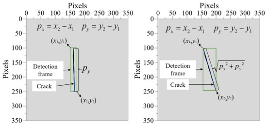 During the loading process of the sample, the high-speed camera was used to capture the crack expansion process at a frame rate of 400 FPS. The coordinates of the upper left and lower right corners of the detection frame for the real–time expansion position of cracks were obtained through the YOLOv5 algorithm model. If the crack expansion direction was approximately parallel to the loading direction, the ordinate of the detection frame were subtracted, and the difference values can be substituted into Equation (9) to obtain the crack expansion length ∆l. If the crack expansion direction and the loading direction were at a certain angle, the horizontal and vertical coordinates of the detection frame were processed by their difference, the obtained horizontal and vertical coordinates were substituted into Equation (10), respectively, and the crack expansion length ∆l can be also obtained. The calculation of crack expansion length is shown in Figure 12. In addition, the crack expansion rate v (mm/s) is the ratio of the crack expansion length Δl to the time t required for the crack expansion.