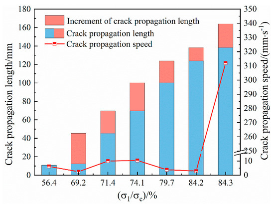 When the stress was loaded to 56.4% σc, the secondary cracks converged to form the master crack 1, the total length of crack expansion was 10.85 mm, and the corresponding initial crack expansion rate was 6.17 mm/s. With the increase in stress, the crack was in a stable expansion stage. When the stress was loaded to 69.2% σc, the crack expansion length was 45.45 mm, and the expansion rate was reduced to 2.46 mm/s. During the propagation process, the expansion rate of the master crack showed a slow decrease or a small fluctuation (2.46~10.40 mm/s) because of the larger aggregates or particles with strong cementation. When the stress was loaded to 84.3% σc, the crack entered the unstable expansion stage, with the master crack 1 expanded to 164.05 mm in a short time, and the expansion rate suddenly increased to the maximum value of 312 mm/s.
