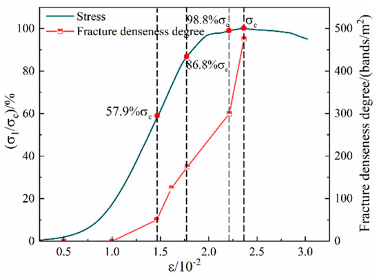 The relationship curve between crack density and stress level of Sj200 sample is shown in Figure 14. Under uniaxial loading, the number of surface cracks increased with the increase in stress level, and the increase in crack density amplification showed the characteristics of stage change. When the stress of the sample was loaded to 57.9% σc, the internal small–scale cracks began to develop, expand, and connect with each other. The macroscopic performance was the initial crack initiation, and the crack density increased from 0 to 50 bands/m2. As the loading continues, the internal micro cracks of the sample develop steadily, and secondary cracks continued to sprout on the surface, promoting a slow increase in crack density. When the stress was loaded to 86.8% σc, the crack density increased to 175 bands/m2. The sample reached the yield stress limit, forming multiple macro master cracks and accompanying a large number of secondary cracks. When the stress was loaded to 98.8% σc, the crack density suddenly increased, and the crack density increased to 300 bands/m2. When the peak stress σc was reached, the crack density increased to a maximum of 475 bands/m2.