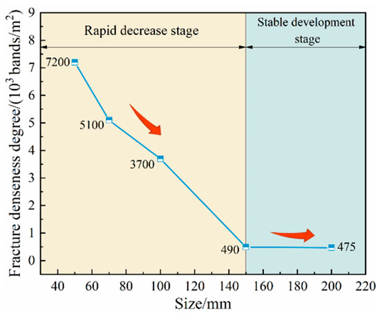 Due to the different sizes of the back–filling concrete samples, there were some differences in the crack density after the failure of the samples. The curve of crack density with size was shown in Figure 15. When the size increased from 50 mm to 150 mm, the difference of crack density was 6710 bands/m2, and the decrease was 93.19%. When the size increased from 150 mm to 200 mm, the difference of crack density was 20 bands/m2 and the decrease was only 4.08%. It can be seen that under uniaxial compression, the crack density of the back–filling concrete sample showed the characteristics of first decline before stabilization with the increase in the size.