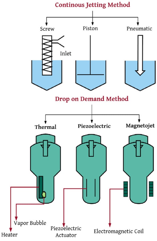 Continuous and drop-on-demand methods of jetting 3D printing methods [17].