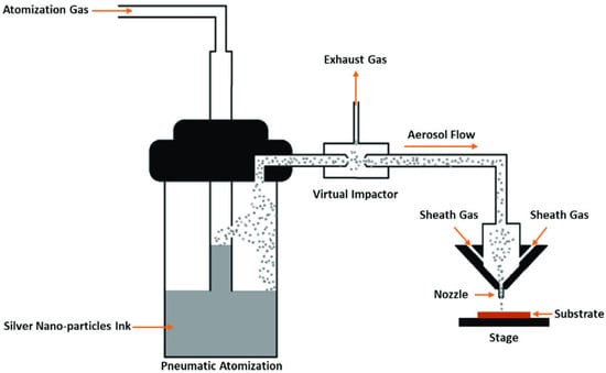 Aerosol Jet Printing (AJP) is the spraying of ink containing small size droplets that are dispersed in the liquid (Figure 4). The technique involves two components: an atomizer and a deposition head. An atomizer is an ultrasonic or pneumatic device that produces a dense vapor of droplets. A carrier gas like nitrogen moves [10,23] across the atomizer in order to transfer the dense vapor into the deposition head section. The resulting material flow leaves the head from a nozzle onto the substrate. This process is suited for 3D utilizations because the deposition head could be mounted to a 5-axis positioning stage to follow the substrate contour at 1 to 5 mm of fixed distance. Furthermore, acquiring fine characteristics is achievable because the aerosol involves a large density of micro-droplets, which are focused on fabricating lines with thickness values of about 10 μm [11,24,25,26].