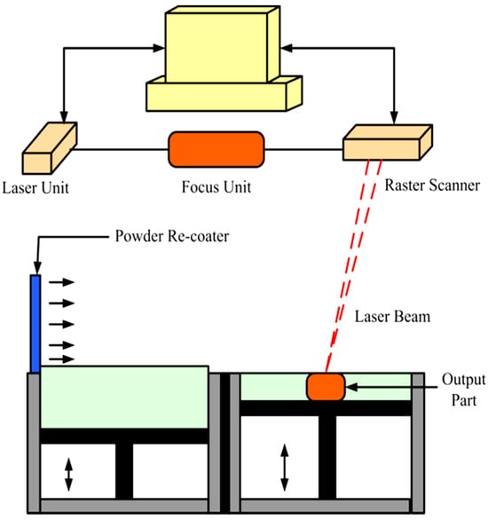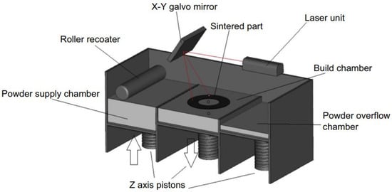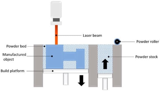 The Selective Laser Sintering (SLS) technique is a method that fabricates layers with predesigned geometry by sintering the powders with the laser beam (Nd-YAG or CO2). This method was developed in 1989 for the additive manufacturing of polymers and has been recently used widely for metals [45]. The technique steps are as follows: (1) the substrate is moved down to a depth equal to the layer thickness; (2) a layer of powder is rolled out on the substrate; and (3) the laser scans deposited a layer of powder to sinter powders at the determined area. Stages 1, 2, and 3 are repeated until the designed sample is completed. A schematic of SLS is depicted in Figure 9 [48,49,50].