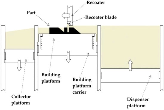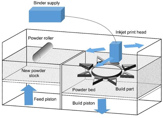 As BJ utilizes binders as the adhesive materials, the material characteristics are not always suitable for automobile and aerospace applications because the binder could lead to porosity formation in conventional sintering techniques. The speed of this technique (12–24 mm/h) is quicker than that of the EBM/SLM techniques and could be accelerated by the increase in the number of the print head holes, which deposit the binder and the material. This also allows the two-material approach in which different binder–powder combinations lead to various mechanical properties by changing the binder-to-powder ratio [31,37,56]. The process schematic is illustrated in Figure 10.