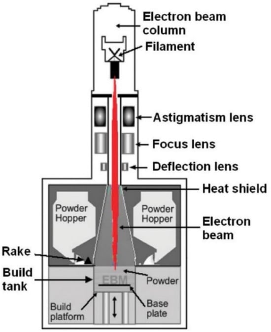Electron Beam Melting (EBM) technology was developed by researchers from Chalmers University of Technology in Sweden in 2003 [40]. The EBM process (Figure 7) applies the electron beam energy to melt the metallic powders. Each layer is provided by the following steps: spreading the metallic powders, preheating and then sintering the powder with a defocused beam that obtains mechanical stability as well as electrical conductivity to the metallic powder layer, melting the powders by using a focused beam, and lowering the building platform by the thickness of one layer which may vary from 50 µm to 200 µm.
