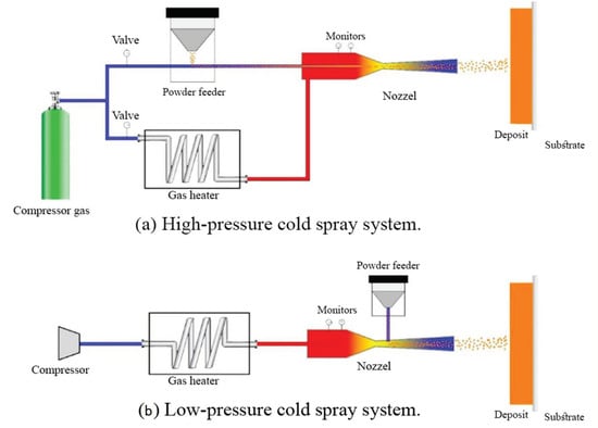 Schematic of (a) high- and (b) low-pressure cold spray processes [63].