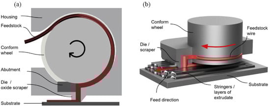 The flow of the material in this method is based on continuous rotary extrusion, which is also recognized as Conform extrusion. The extrusion sequence involves two steps. In the first step, the feedstock is deformed in an extruder. This step causes the oxides present on the feedstock surface to become dispersed into the extrudate. In the second step, the extruder supplies the pressure to acquire bonding at the interface between the underlying structure and the extrudate. According to Figure 14a, the extrusion pressure is produced by the frictional force between the tapered groove and the feedstock wire in the rotating wheel. The feedstock is compressed into the groove and is also driven forward by the wheel rotation. Then, the feedstock wire is blocked by the abutment and axial compression is induced. This causes the material to be yielded and fill the cross-section. This enhances the contact surface and also the friction and leads to a build-up in further pressure and causes the material to flow out of the die. Figure 14b represents the HYB-AM deposition process. The extruder adds the material as it shifts in the deposition direction and places stringers side-by-side to create a layer. Then, it allows new layers to be built on the top of the material. The die is constantly scrapping the underlying layer top during deposition, and then the adjacent stringer side wall removes the surface oxide. Before the deposition, a metal strip is fixed on the heated bed to behave as a substrate on the first layer of the deposited material. In the HYB-AM process, the merging metal streams must be considered as the mating streams of substrate and extrudate, as shown in Figure 15 [65,66].