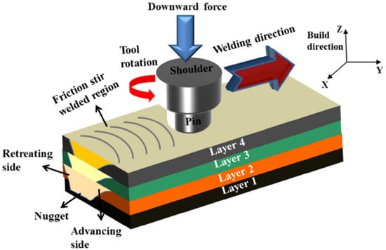FSAM falls into the category of solid-state additive manufacturing processes that could be considered a combination of layer-by-layer FSW and AM processes. Owing to its exceptional ability for microstructural engineering and grain refinement, it can be useful in tuning microstructures to fit the customer’s requirements. It is reported that high-strength alloys could be fabricated by this process. In FSAM, the fundamental layer-by-layer AM is employed. Hence, a stack of overlapping sheets/plates is penetrated by a consumable tool, and the FSLW process is conducted along the defined direction. Figure 17 illustrates a schematic diagram for the FSAM process. Friction and plastic deformation in a workpiece create enough heat for the joining of the layers. The joint creation is made possible as a result of the material transfer, heat generation, and material consolidation from the front to the tool’s rear parts. In addition to process parameters, the tool geometry during FSAM also partially defines the macroscopic and microscopic aspects of the manufactured parts [71,72,73].