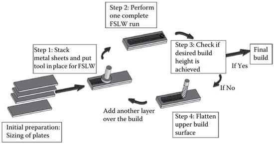 - Flattening of the upper surface: If the required build height is not made, the deposition of new layers over the build is needed. Therefore, the upper surfaces of the previously fabricated layers are flattened in order to remove the flash that occurred during FSLW. After surface preparation, a new sheet/plate is placed over the top layer. Then, steps 2–4 are repeated until the desired height of the build is provided [75].