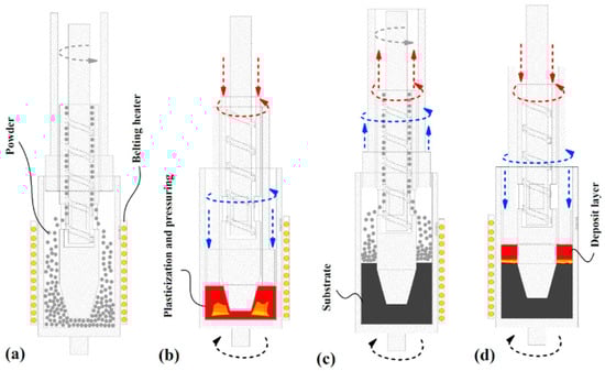 FFTAM method steps: (a) the introduction of the powder, (b) powder pressing by forging and rotational friction stirring, (c) the addition of the next layer of the powder, and (d) the new layer pressing under friction forging (gray arrows: rotation direction of the inert part, red: rotation direction and movement of the inert tools; blue: rotation direction and movement of the outer tools) [71].