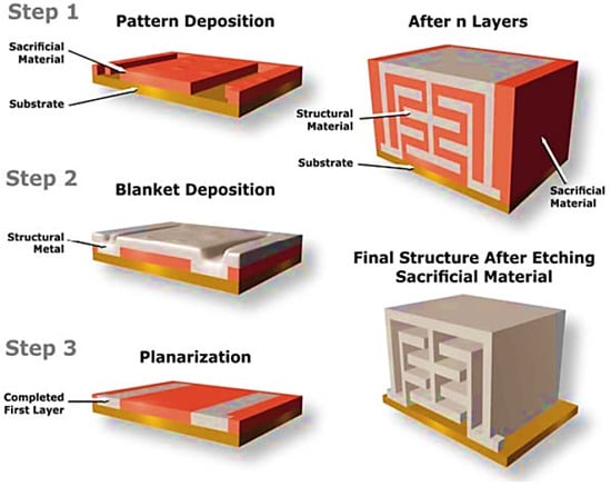 - Cohen, A.; Zhang, G.; Tseng, F.G.; Mansfeld, F.; Frodis, U.; Will, P. EFAB: Batch Production of Functional, Fully-Dense Metal Parts with Micron-Scale Features. In 1998 International Solid Freeform Fabrication Symposium; The University of Texas at Austin: Austin, TX, USA, 1998. [Google Scholar] [CrossRef]