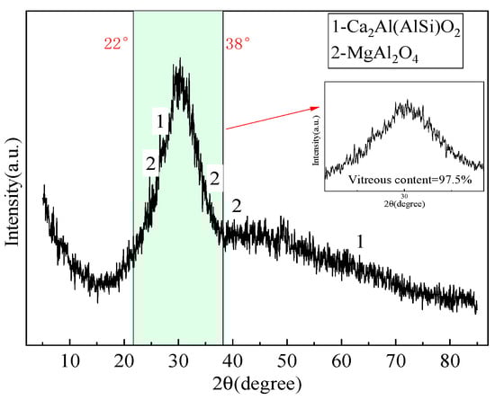 The phase compositions of various industrial solid wastes were tested using X-ray diffraction analysis (XRD). For the GGBS, the testing rate was reduced from 5°/min to 0.8°/min at 22~38° in order to better obtain the amorphous phase content, and the test results are shown in Figure 1, Figure 2 and Figure 3.
